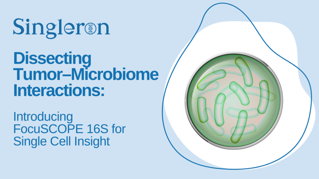 Dissecting Tumor–Microbiome Interactions: Introducing FocuSCOPE 16S for Single Cell Insight 25.02.20255’ Products Single cell sequencing Intracellular bacteria are known to influence the development, progression, and treatment of cancer. However, studying these microbes in the tumour microenvironment has been challenging. Bulk sequencing methods fail to distinguish bacterial RNA signals at cell-type-specific level, making it difficult to identify which host cells harbour specific bacterial transcripts.FocuSCOPE 16S is a new single cell technology designed to overcome these limitations. By capturing bacterial and host RNA from the same cell, it enables researchers to study host–microbiome interactions with greater resolution.The Role of Intracellular Bacteria in Cancer Bacteria are found intracellularly across many major tumor types both in cancerous and stromal cells [1]. Studies have reported that intracellular bacteria can affect tumor growth, immune modulation, and resistance to therapy [2]. However, their presence in tumours is often at low abundance, making them difficult to detect. Using 16S rRNA sequencing, NGS-based bacteria detection methods have significantly improved detection sensitivity. However, current bulk sequencing methods provide only an overall bacterial composition without linking bacterial presence to specific host cells. This limits the ability to study the difference in bacteria composition in cancer, immune, or stroma tissues, the interaction between bacteria and host cells, and the mechanism of action. FocuSCOPE 16S: A Single Cell Approach in Intracellular Bacteria DetectionFocuSCOPE 16S allows researchers to detect bacterial ribosomal RNA (rRNA) in individual host cells while simultaneously capturing the full transcriptome from the same cells. This approach provides insights into: The microbiome profile within specific cell types. How bacterial presence and distribution correlate with tumor, immune, or stroma cell genotypes and phenotypes. Potential pathways by which bacteria populations influence tumor progression, immune response, and drug resistance. How It Works FocuSCOPE bead design: Figure 1. FocuSCOPE bead design. FocuSCOPE uses barcoded magnetic beads to capture RNA of interest. For FocuSCOPE 16S, each bead contains two kinds of barcode: A poly(dT) probe that captures poly-adenylated host mRNA Multiple non-poly(dT) probes, designed to target bacteria rRNA binding to constant regions near hypervariable regions. Streamlined workflow Due to its unique barcode design, FocuSCOPE 16S follows the same workflow as standard single cell RNA sequencing, requiring no extra steps to capture both host mRNA and bacterial rRNA in parallel. A single experiment produces data on host gene expression and bacterial transcripts from the same cell. Figure 2. Overview of the FocuSCOPE 16S workflow. FocuSCOPE 16s Workflow Steps: 1. Tissue or Cell PreparationSolid tissues can be dissociated into single-cell suspensions using the sCelLiVE kit. This process can be automated using the Singleron PythoN or PythoN Junior tissue dissociator. 2. Single-Cell Capture and Barcoding: Cells are loaded onto the SCOPE-chip, where barcoding beads capture host mRNA and bacterial rRNA molecules. This step can be automated using the Singleron Matrix® NEO instrument. 3. cDNA Amplification and Library Preparation: The barcoded cDNA is amplified and prepared for sequencing.4. NGS Library Construction: Two sequencing libraries are generated: A host transcriptomics library (for mRNA analysis). A bacterial rRNA library (for microbiome profiling). Potential Applications of FocuSCOPE 16s Intracellular Bacteria Detection Tumor Microbiome Analysis Identify bacteria present within tumor and stromal cells Determine which cell types harbor bacterial transcripts in tumor microenvironment. Compare microbial profiles between cancerous and adjacent normal tissues. Immune Modulation Studies Investigate how intracellular bacteria interact with immune cells. Study bacterial contributions to immune suppression Therapy Response Research Explore bacterial associations with tumor clones that demonstrate chemotherapy or immunotherapy resistance. Assess microbial influence on treatment outcomes in clinical samples. Case study Oral cancer is often associated with a high level of pathogenic bacteria [3]. FocuSCOPE 16S was used to analyze oral cancer tissues and demonstrated cell-type specific distribution of intracellular bacteria (Figure 3). It overcame the limitation of current analysis methods and was able to reveal the distribution of different bacteria genus in different cell type clusters (Figure 4).Figure 3. FocuSCOPE 16S identified bacterial rRNA expression across different cell types in oral cancer tissue. Left: Cell clustering result. Right: bactera UMI count (B,D). Scale bar: Number of bacterial UMIs detected per cell. Abbreviations: ECs – Endothelial Cells; MPs – Macrophages; pDCs – plasmacytoid Dendritic Cells; SMSCs – Stromal Mesenchymal Stem Cells.Figure 4. FocuSCOPE 16S identifies bacteria genus present in different cell type clusters. ConclusionUnderstanding how intracellular bacteria contribute to cancer requires tools that can link microbial signals to specific host cells. FocuSCOPE 16S provides a single cell approach to studying these interactions, offering a more detailed view of the tumor microbiome.Contact us to discuss potential applications in your research. References[1] Nejman, D., et al. The human tumor microbiome is composed of tumor type–specific intracellular bacteria. Science 368, 973-980 (2020). DOI: 10.1126/science.aay9189 [2] Chai, X., et al. Intratumor microbiome features reveal antitumor potentials of intrahepatic cholangiocarcinoma. Gut Microbes 15(1), 2156255 (2023). DOI: 10.1080/19490976.2022.2156255 [3] Zeng, B., et al. The oral cancer microbiome contains tumor space-specific and clinicopathology-specific bacteria. Front Cell Infect Microbiol. 27(12), 942328 (2022) DO