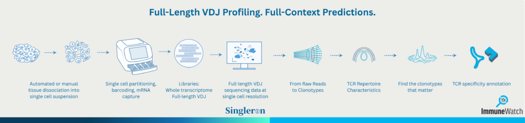 Predicting Epitope Specificity in Single Cell Immune Repertoire Data 27.04.20268’ Immunology Infectious diseases Understanding the adaptive immune response goes far beyond simply counting T-cell clones. To truly decode T-cell biology, you need to know not just which T-cells are expanding, but what they are responding to.While identifying clones provides a snapshot of the immune repertoire, the epitope – and by extension the antigen- recognized by these clones remains the fundamental unit of functional significance. Whether the goal is to pinpoint the viral protein triggering an expansion or to identify the specific tumor antigen targeted by infiltrating lymphocytes, the ability to map a TCR to its cognate antigen is what transforms data into biological insight.This functional understanding is critical across a variety of advanced applications:T-cell therapy quality control: Characterizing tumor-infiltrating lymphocytes (TILs). Ensuring that the induced T-cells after treatment or in a product have the targeted specificity, and aren’t contaminated with bystanders.Precision immunomonitoring: Tracking the evolution of a patient’s immune response in real-time during clinical trials to validate drug efficacy.Target discovery in autoimmunity and oncology: Deconvoluting the complex TCR repertoires of patients to identify the “self-antigens” that elicit an immune response.The Limits of Standard ProfilingSingle cell immune profiling has revolutionized our ability to study T-cells by combining the T-cell transcriptome with their clonal TCR diversity. Platforms that generate full-length V(D)J sequences paired with whole-transcriptome data provide an incredibly high-resolution view of the immune repertoire.However, this leaves a critical bottleneck. Standard bioinformatics pipelines excel at clonotype assembly and diversity quantification, but they cannot inherently interpret the biological meaning of a CDR3 sequence. But that leaves the most important question unanswered: What antigens are these T-cell receptors actually recognizing?From Tissue Sample to Functional AnnotationTo solve this bottleneck, Singleron Biotechnologies and ImmuneWatch have combined their respective expertise into a single, integrated workflow. By pairing Singleron’s highly precise single cell sequencing platforms with ImmuneWatch’s state-of-the-art immunoinformatics pipelines, you gain a seamless path from raw sample to functional epitope annotation.The result is a transformation of raw sequence data into actionable immunological insight. You can bypass the high costs and slow timelines of traditional antigen discovery, allowing you to finally link clonal expansion directly to its functional target.The Integrated Workflow: From Tissue to TargetThe combined analytical pipeline consists of three phases: single cell partitioning, upstream processing, and downstream machine-learning-driven TCR or epitope specificity prediction.Phase 1: Single Cell Partitioning and Library Preparation (Singleron)The workflow begins with high-quality sample preparation. Using Singleron’s one-day workflow you can get from tissue to final single cell whole transcriptome and full-length VDJ libraries within one workday.Tissue Processing Solid tissues are dissociated into viable single cell suspensions using manual protocols or automated systems like the PythoNi™. Cryopreserved cells can also be used, offering flexibility for longitudinal studies or multi-site collaborations.Cell Partitioning and mRNA Capture Cells are loaded onto the SCOPE-chip® microfluidic platform, where they’re partitioned into individual microwells alongside barcoded capture beads. These beads capture poly-adenylated mRNA from each cell, including the targeted immunoreceptor transcripts. This poly-A-based approach ensures robust transcriptome coverage while simultaneously capturing TCR and BCR sequences.Library Generation with sCircle® Here’s where Singleron’s technology delivers a distinct advantage. The sCircle® Single Cell Full-Length Immunoreceptor Library Kit uses a proprietary cDNA circularization process that brings the V(D)J region closer to the sequencing primer. This enables full-length sequencing of the entire V(D)J region, including the complete CDR3, as well as V, D, J, and C gene segments. The library is compatible with standard short-read sequencing platforms.Why does full-length matter? Because many epitope prediction algorithms, including ImmuneWatch DETECT, perform better with complete receptor sequences. Partial CDR3 data limits predictive accuracy; full-length data maximizes it.Sequencing Multiplexed libraries are sequenced to generate both enriched TCR/BCR transcripts and corresponding whole-transcriptome data, all linked at single cell resolution.“Our team tested the PythoN dissociator across multiple human tumor tissues and found we were able to extract a significantly higher number of live immune cells compared to a competing tissue dissociation product.”— Dr. Andrew Shuparski, Scientist II, Immunai, USAPhase 2: Initial Data Processing (Singleron)Raw sequencing data is processed through the CeleSCOPE® bioinformatics pipeline, a free command-line tool available on GitHub.Transcriptome Alignment Paired-end FASTQ files are mapped to the reference genome, generating gene expression matrices for downstream analysis.Clonotype Assembly Full-length TCR clonotype sequences are reconstructed, with chain pairing information preserved. This is where Singleron’s capture efficiency really shows: the platform achieves mouse TCR α-β chain productive pairing rates exceeding 80% and human BCR IgH-IgK/IgL pairing rates exceeding 85%. High pairing rates mean more complete data for every cell analyzed.Quality Control Reporting CeleSCOPE generates comprehensive QC reports detailing cellular capture rates, median UMIs per cell, sequence diversity metrics, and chain pairing statistics. This gives you confidence in your data before moving to