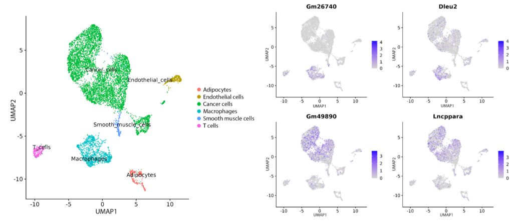 Figure 1: Mouse bladder cancer FFPE single-nucleus sequencing data clustered by gene expression and overlaid with non-coding RNA expression.