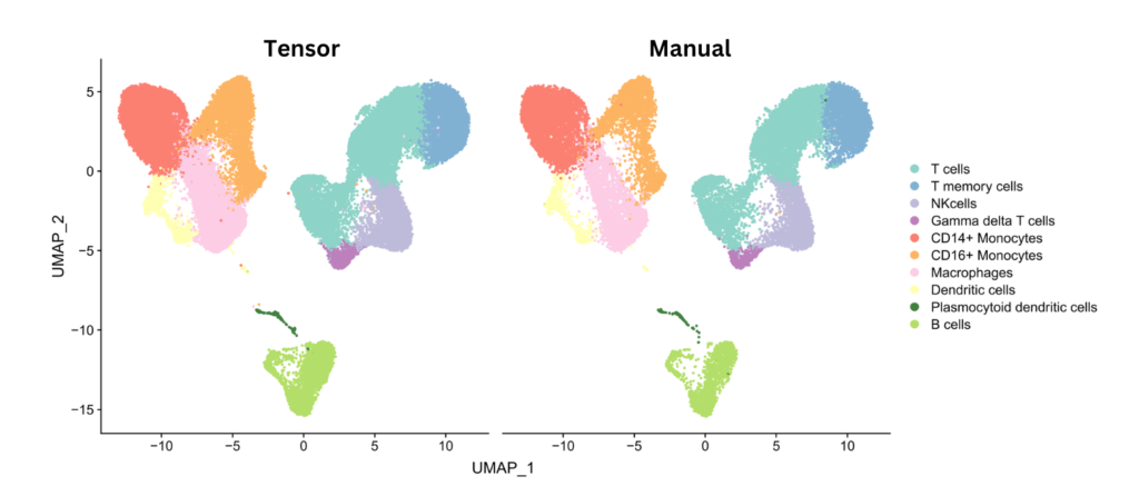 30K PBMC per sample were loaded on chip and processed into transcriptomic libraries either with Tensor (n=8) or manually (n=4). The histogram shows the proportion of each respected cell type in Tensor samples (n=8). Here, we demonstrate that the biological diversity of cell types remains consistent and no technical artifact can be observed.