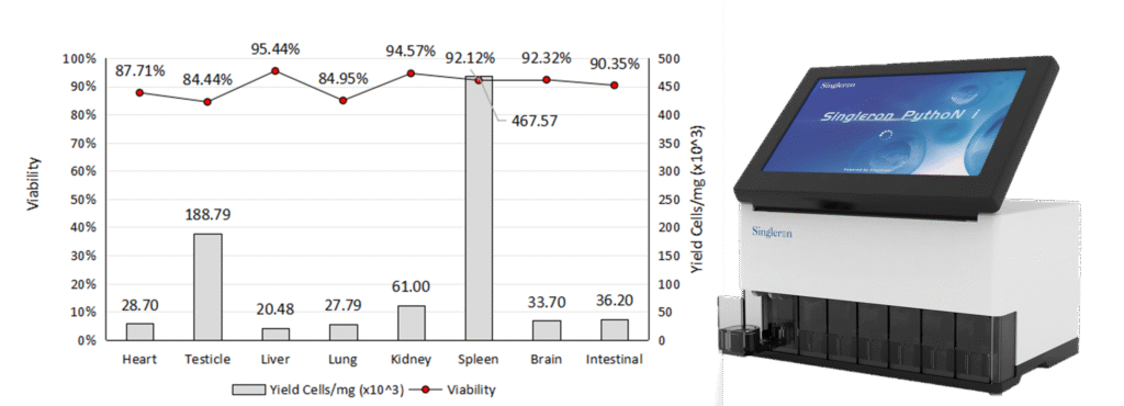 Quality controls after tissue dissociation for single cell RNA sequencing 28.10.20258’ Tissue dissociation When cells come together, they form tissues and organs. These building blocks exhibit diverse cell-type-specific traits and gene expression patterns that dictate a tissue’s developmental pathway, stress responses, and physiological behavior. Single cell RNA sequencing (scRNA-seq) can characterize these responses by monitoring gene expression within individual cells. But to properly elucidate single cell phenotypes, their tissues must be dissociated (know-how) in such a way that the cells of interest preserve a cell’s viability and structural integrity.This task is not an easy feat.On the one hand, overly aggressive approaches can induce cell death and stress-related transcriptional responses that compromise the cells you’re trying to characterize. On the other hand, insufficient tissue dissociation also produces clumps that create noise in scRNA-seq data.Therefore, for scRNA- and snRNA-seq to produce reliable single cell transcriptomics data, quality control (QC) steps must be implemented after tissue dissociation.Cell viability: Keeping your cells aliveCell viability determines how many single cells are still alive after dissociating the tissues of interest. This value can either be reported as a viability percentage or as a ratio of live to dead cells.Why it’s importantCell viability assesses whether your protocols may contribute to cell stress and death. Tissue dissociation protocols use chemicals, enzymes, or mechanical methods to isolate individual cells. These methods can kill cells when performed too long or too harshly. In such cases, your cells’ phenotypes may change to the point they do not reflect their physiological state in vivo.The presence of debris can also compromise the success of a scRNA-seq run. Debris can be intracellular contents released upon lysis, extracellular matrix components, or fibrous biomolecules. For each case, debris can be mistaken as viable cells, becoming false positives that artificially raise cell numbers when preparing scRNA-seq libraries.What to doBefore proceeding with library preparation, make sure you keep as many cells viable as possible. You can do this using Singleron’s PythoN i tissue dissociation machine. Although researchers can expect to achieve ~70% viability, Singleron’s PythoN i can dissociate tissues to yield cells at 90% viability.Regardless of whether you use the PythoN i, you should have a single cell suspension immediately after tissue dissociation. Use dyes that distinguish viable (live) and non-viable (dead) cells. Trypan Blue stains under a brightfield microscope can identify dead cells and debris by staining blue. For a more quantitative approach, consider using a combination of acridine orange or SYTO9 and propidium iodide.Trypan Blue: Trypan Blue is an azo dye and is one of the first dyes to distinguish between viable and non-viable cells. The dye is membrane-impermeable and emits a blue color when it intercalates with intracellular proteins in membrane-compromised cells. Although the dye is an excellent quality control indicator, it also stains debris, compromising its quantitative capabilities. For a basic Trypan Blue staining protocol, click here.Propidium iodide: Propidium iodide (PI) is a membrane-impermeable nucleic acid dye. When it binds to the DNA of membrane-compromised cells, the dye emits a red color. The dye can be used alone, but it can also be used in a mixture with other dyes such as SYTO9 (see below).Acridine Orange: Acridine orange is a planar fused-ring acridine molecule that binds to DNA and RNA. The dye is cell-permeable but adopts distinct emission properties when it binds to DNA and RNA. The dye emits an orange color when it binds to RNA, but a green color when it binds to DNA. This property has helped researchers distinguish between cells at different phases of the cell cycle1 and identify viable cells.SYTO9: SYTO9 is a green, fluorescent dye that binds to DNA in viable and non-viable cells. The dye is most used in combination with PI to distinguish viable cells that stain green and non-viable cells that stain red. The cell populations can then be sorted using flow cytometry and fluorescence-activated cell sorting (FACS).Also consider using Singleron’s PythoN i machine. It dissociates most tissues within 15 minutes and skin within 60 minutes. It can also integrate quality controls seamlessly while retaining 90% cell viability for downstream protocols.The PythoN i instrument (right) and a graph (left) demonstrating that PythoN i enables tissue dissociation with high cell viability and yieldLearn more about PythoN ITM: Intelligent Tissue Dissociation systemCell clumping: Isolating your cells, one by oneCell clumps arise when more than one cell is associated together. Clumping of these cells most commonly happens when tissues are not sufficiently detached from the rest of the tissue.Why it’s importantThe success of a scRNA-seq study depends on successfully loading individual viable cells into wells, a trait critical for producing high-quality scRNA-seq libraries. Cell clumping can cause too many cells to be loaded on a microwell chip. Failing to minimize cell clumping will increase the probability of detecting a doublet or multiplet in single cell isolation protocols2. The multiplets can produce hybrid transcriptional profiles that would then be misinterpreted as a novel lineage discovery in single cell data analyses3.What to doBrightfield or confocal microscopy remains the best way to determine whether your cells are clumping. In addition, use cell counters to determine the precise number of cells you have. Accurate cell counts reduce the risk of overloading chips during cell capture. This ensures optimal input and reduces the risk of clumping for downstream sequencing.You can also use Singleron’s chips, which capture between 3000-20000 cells at standard density. If you’re 