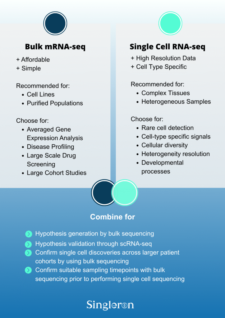 Should I Choose Single Cell Sequencing or Bulk Sequencing? 08.10.20253’Over the past decade, single cell sequencing has transformed how we study complex tissues and heterogeneous diseases. Meanwhile, bulk sequencing remains a gold standard for cost-effective, high-throughput genomics. Instead of choosing one over the other, leading researchers recommend combining bulk and single cell sequencing to deliver comprehensive insights.When to Perform Bulk Sequencing?Bulk mRNA-seq or whole-genome sequencing offers population-level insights of tissues or cell populations, delivering a comprehensive snapshot of the average genomic or transcriptomic landscape. We can easily detect global gene-expression or mutational differences between healthy and diseased samples and assess transcriptomic changes induced upon drug treatment.Precision Medicine & Oncology: Detect low-frequency variants and overall mutational load to guide targeted therapies.Infectious Diseases: Track pathogen evolution across entire patient cohorts or environmental samples.Developmental & Stem Cell Biology: Map global gene-expression patterns during differentiation.Drug Screening: Identify global transcriptomic or genomic responses to candidate compounds; prioritize which treatments deserve single-cell follow-up.This broad view helps you spot major trends—such as pathway activation, resistance mechanisms, or off-target effects— prioritize targets and refine hypotheses.Learn more about how bulk RNA-seq works.What does Single Cell Sequencing Show that Bulk Sequencing can’t?Single cell sequencing reveals cell-type-specific gene expression, clonal diversity, and rare-cell populations that bulk methods can miss.This high-resolution view of gene expression in individual cells, uncovers a complexity that bulk sequencing inevitably averages away.Cell-type–specific gene expression: Profile thousands to millions of cells to discover previously unrecognized subpopulations.Clonal diversity and evolution: Track tumor subclones, immune-cell clonal expansions, or microbial strain variation to understand how populations adapt or resist therapy. (Learn more à link to FocuSCOPE)Rare-cell detection: Identify ultra-rare populations—such as therapy-resistant cancer cells, dormant stem cells, or pathogen-infected cells—that can dictate disease progression.Dynamic state mapping: Capture transient cellular states (e.g., activation, stress response, cell-cycle stage) that bulk averages obscure.Trajectory and lineage inference: Reconstruct developmental pathways or differentiation hierarchies, revealing how cells transition from progenitors to specialized fates.Multi-modal integration: Pair scRNA-seq with single-cell ATAC-seq, transcription dynamics or glycosylation states to link chromatin accessibility, RNA turn-over and glycan-mediated mechanisms at single cell resolution.Synergy: From Validation to Discovery Synergy: From Validation to DiscoverySingle-cell RNA-seq is unparalleled for resolving cellular heterogeneity, but bulk sequencing remains the method of choice when completeness, sensitivity, and quantitative accuracy across an entire tissue or population are critical. When used together, they give researchers a deeper, more reliable picture than either method alone:Hypothesis Generation: Use bulk data to flag pathways of interest, then zoom in with single cell sequencing to pinpoint which cells drive those changes.Validation & Scaling: Confirm single cell discoveries across larger patient cohorts or timepoints with bulk sequencing.Multi-omics Integration: Combine genomic, transcriptomic, and epigenomic layers for a systems-level view. Additional value can be added through RNA dynamics, glycosylation states, or detection custom sequences such as SNV, fusion genes or splice variants.Practical ConsiderationsCost Efficiency: Bulk sequencing remains more affordable for large sample numbers; pair it with targeted single cell experiments for depth.Data Robustness: Bulk data provides statistical power, while single cell data offers granularity.Translational Impact: Integrated datasets accelerate biomarker discovery and therapeutic development.Impact on our Current KnowledgeFor researchers and clinicians across various fields such as oncology, infectious disease, and regenerative medicine, this synergy accelerates:Drug discovery: Bulk screens rank candidate compounds; single cell follow-ups reveal mechanism and cell-type specificity.Biomarker development: Bulk provides statistical power for cohort studies; single-cell pinpoints which cells produce the marker.Translational research: Integrated datasets support regulatory submissions and clinical decision-making.In summary, bulk mRNA sequencing and single cell sequencing are not competing technologies but should be viewed more as complementary tools. By combining population-level context with cellular-resolution insights, you can uncover mechanisms that remain hidden when each method is used in isolation. If your lab already embraces single cell sequencing, adding bulk RNA-seq or whole-genome sequencing isn’t redundant—it’s strategic. Together they provide depth, accuracy, and context that drive more confident discoveries and more reproducible science.Ready to integrate bulk and single cell sequencing? Our team can help design experiments and build bioinformatics pipelines tailored to your project goals. Contact us today to explore a workflow tailored to your research. A post by Samantha LangerSamantha is defined by her journey from the lab bench to strategic leadership. Her scientific foundation, rooted in a PhD in Molecular Biology and hands-on experience as an Application Scientist, provides a critical advantage. She has supported researchers across complex areas like oncology, hematology, and niche fields like gravitational biology, giving her a comprehensive view of scientific challenges.As Senior Marketing Manager, she directs the team and drives the strategic vision for the Europea